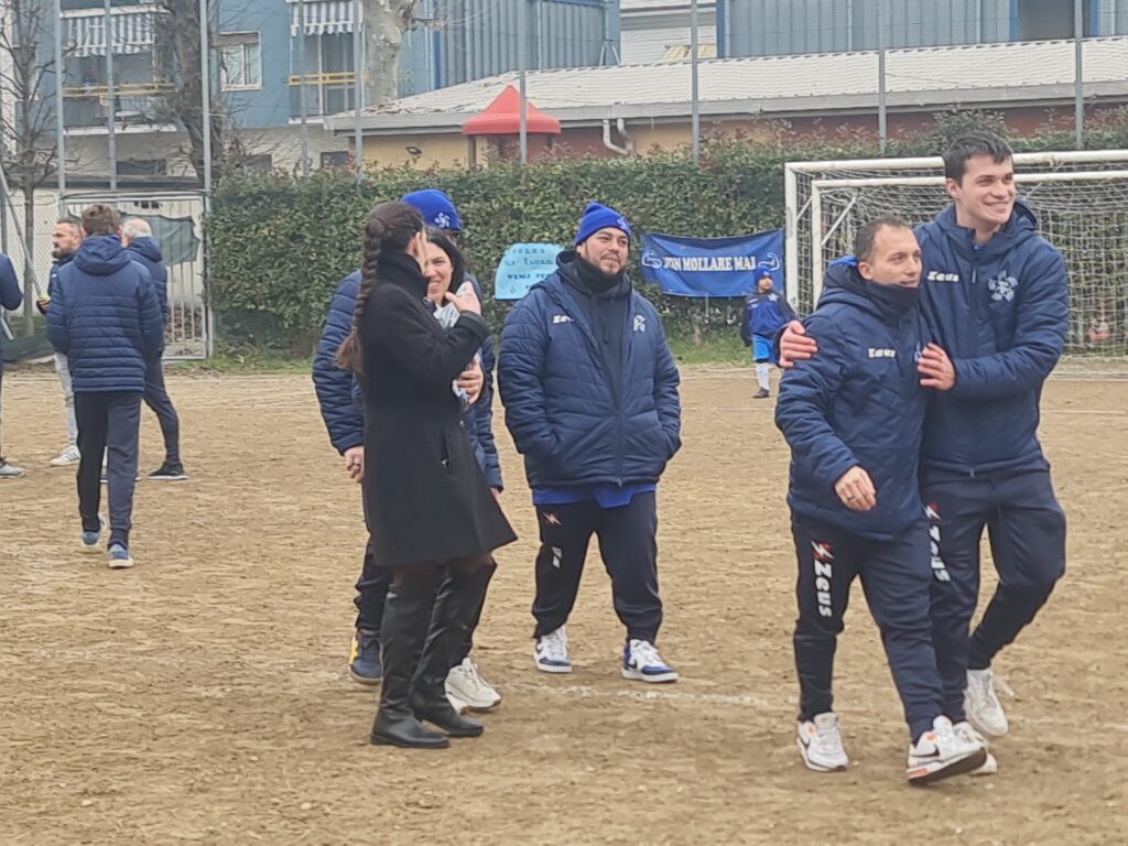 Siamo ormai nel recupero, il sogno è sempre più vicino ed ecco che l’arbitro mette il fischietto in bocca per decretare la fine di una partita unica per intensità. I “mister” si abbracciano, i ragazzi corrono a festeggiare sotto la curva.